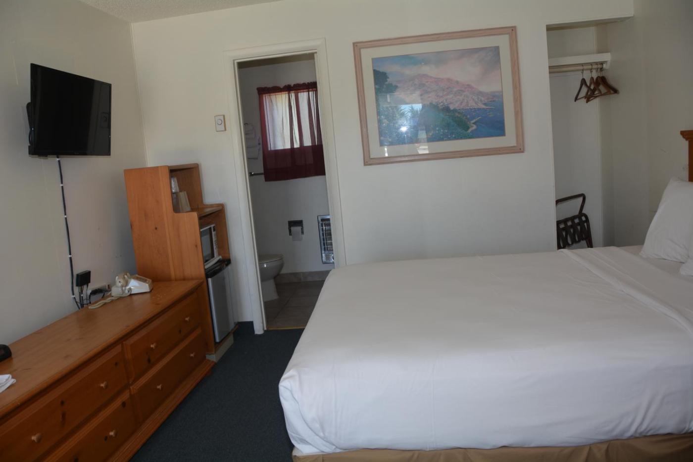 A clock radio and private bathroom are included in every simply furnished room at the Pacific Sunset Inn.rooms are warmly decorated with carpeted floors and richly colored bedding.