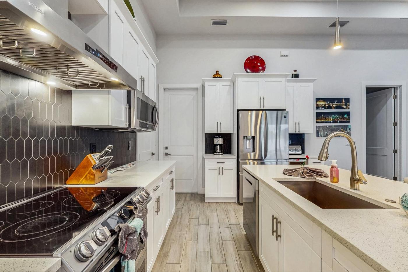 Four-Bedroom House. This holiday home features a private pool and a fireplace. Boasting a private entrance, this spacious holiday home also features 4 bedrooms, a seating area and 3 bathrooms with a bath and a shower. Guests will find a stovetop, a refrigerator, a dishwasher and kitchenware in the well-fitted kitchen. The holiday home also comes with a barbecue. The air-conditioned holiday home features a TV with streaming services, a washing machine, a tea and coffee maker, a dining area as well as pool views. The unit has 4 beds.