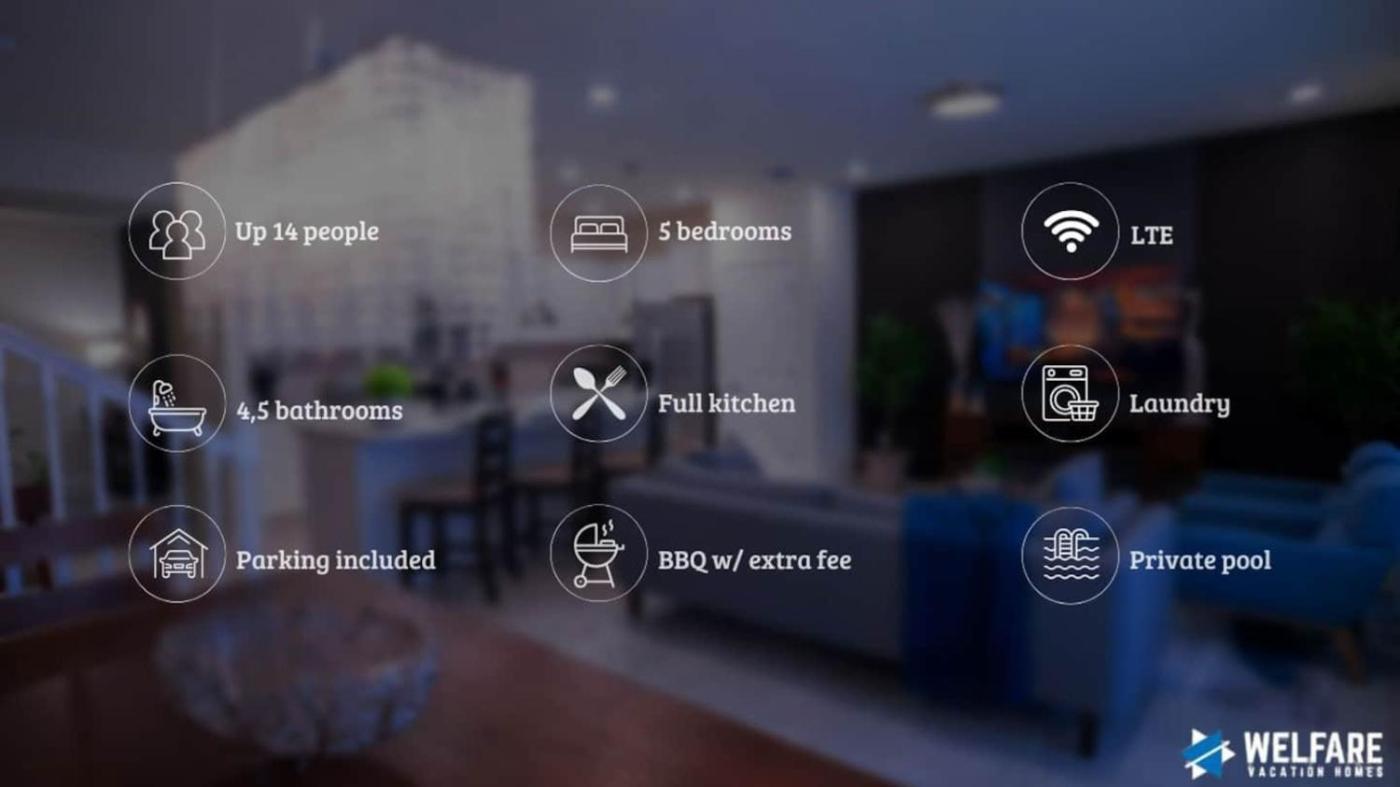 Five-Bedroom House. This holiday homes standout features are the private pool and fireplace. This spacious holiday home features 2 living rooms, 5 separate bedrooms and 5 bathrooms with a bath and a shower. Guests will find a stovetop, a refrigerator, a dishwasher and kitchenware in the fully equipped kitchen. The holiday home also comes with a barbecue. Boasting a patio, this holiday home also features air conditioning, a washing machine and a TV. The unit has 5 beds.
