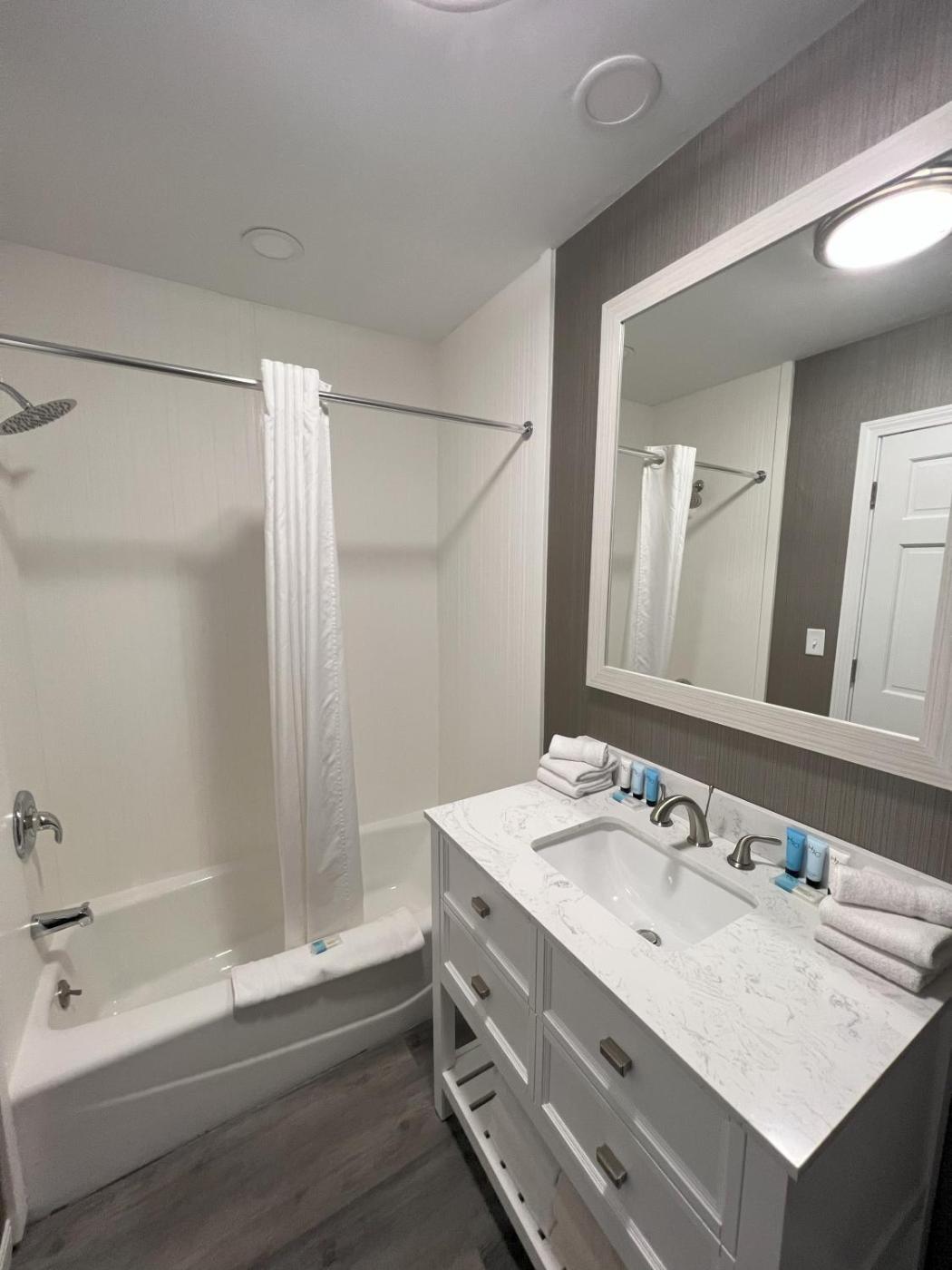 Courtyard One King. The newly renovated Courtyard Rooms are very popular with guests as they are centrally located on our property with the option of first or second floor. These rooms do not have a view of the lake but are steps from our lakefront area featuring our heated pool, Cabana Bar, lakeside dining, beach & lakeside firepits. This room features one king bed and is nicely appointed with a granite vanity, cast iron bathtub, laminate tile flooring, refrigerator, cable tv, microwave, coffee maker, hair dryer, iron and ironing board. Two chairs are located outside the room for your use. Second floor rooms have exterior stair access only.of our rooms are non-smoking and pets are not allowed. ;