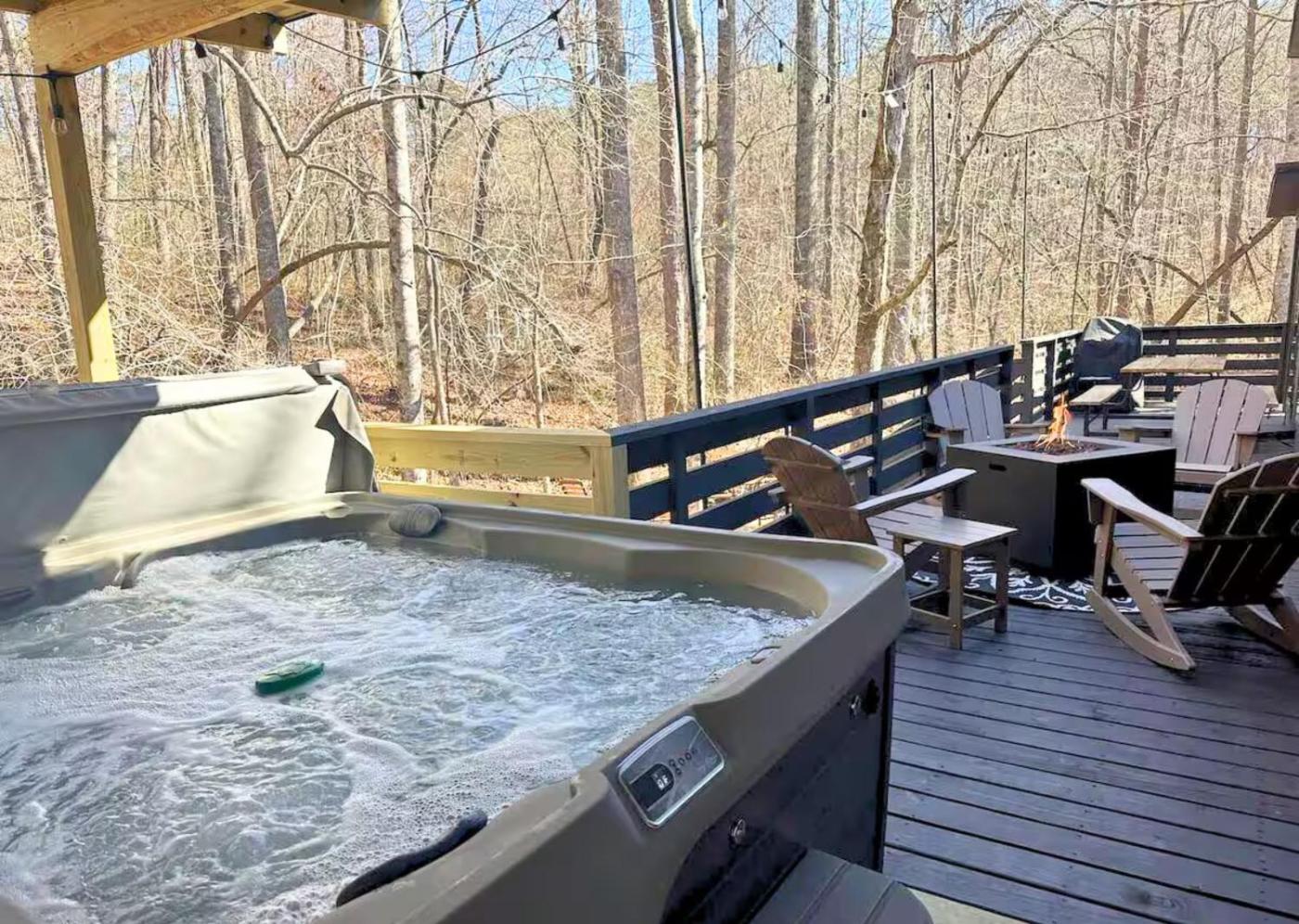 Two-Bedroom House. The hot tub and fireplace are the standout features of this holiday home. Boasting a private entrance, this air-conditioned holiday home comes with a kitchen, 2 bedrooms and 1 bathroom with a bath and a hairdryer. Guests will find a stovetop, a refrigerator, kitchenware and an oven in the kitchen. The holiday home also includes a barbecue. This holiday home has a washing machine, a coffee machine, a flat-screen TV and a patio. The unit has 3 beds.