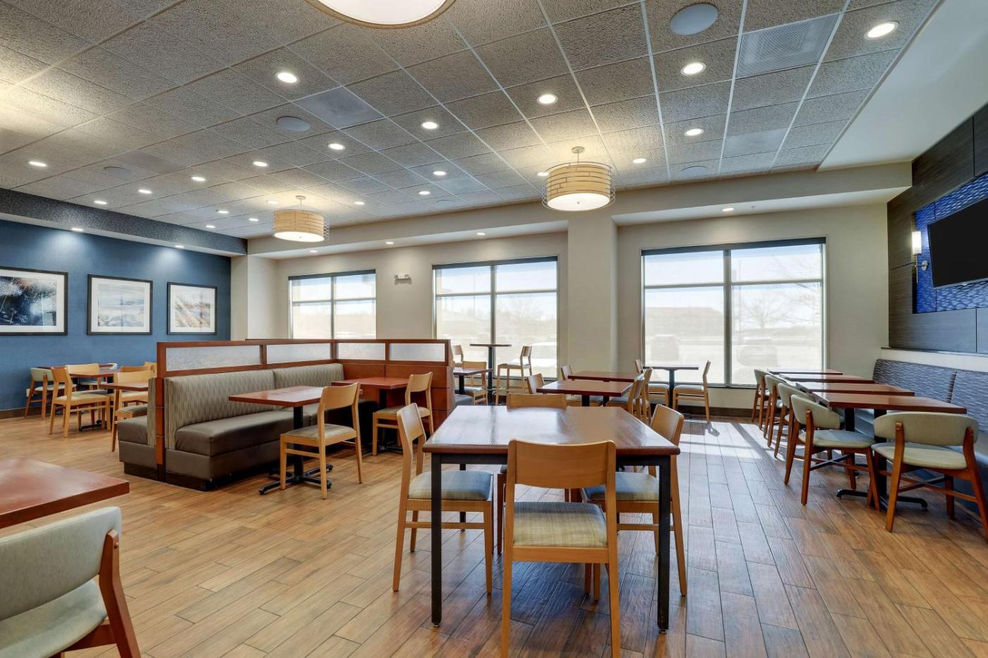 A daily hot breakfast with eggs, sausage, waffles, and more is served. In the evenings, guests are welcome to enjoy free appetizers, beer, and wine in the lobby.