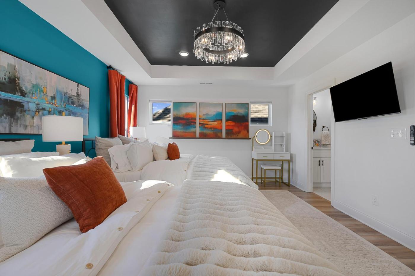 Three-Bedroom Villa. The hot tub and fireplace are the standout features of this villa. Boasting a private entrance, this air-conditioned villa features 1 living room, 3 separate bedrooms and 3 bathrooms with a walk-in shower and a bath. Guests will find a stovetop, a refrigerator, a dishwasher and an oven in the kitchen. The villa also comes with a barbecue. The spacious villa features a washing machine, a tea and coffee maker, a seating area, a flat-screen TV with streaming services, as well as garden views. The unit has 5 beds.