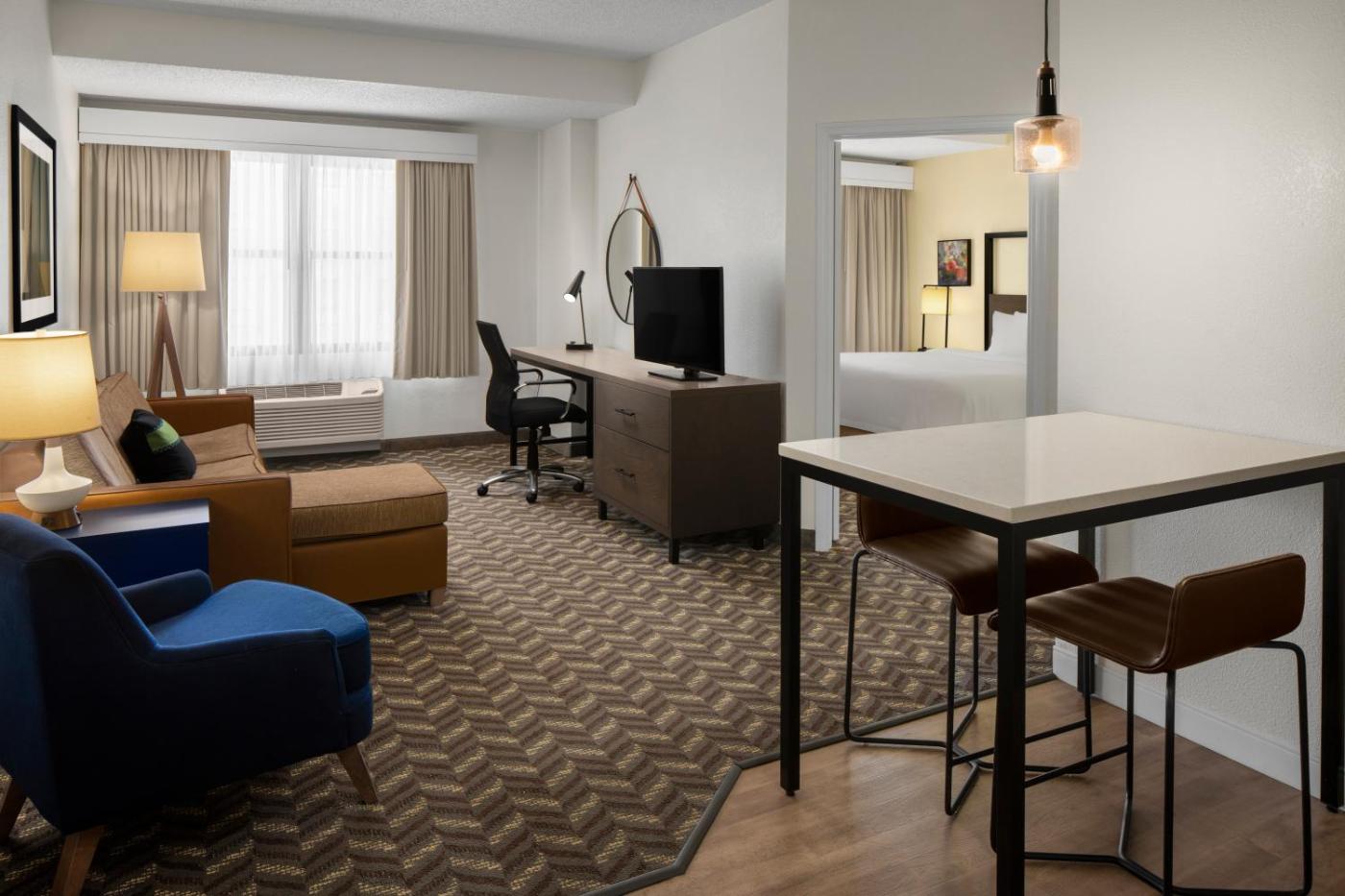 The accommodations at the New Rochelle Residence Inn include a living area with a sofabed and cable TV. The kitchen is complete with a stovetop, oven and dishwasher. Cookware and dishware are provided.