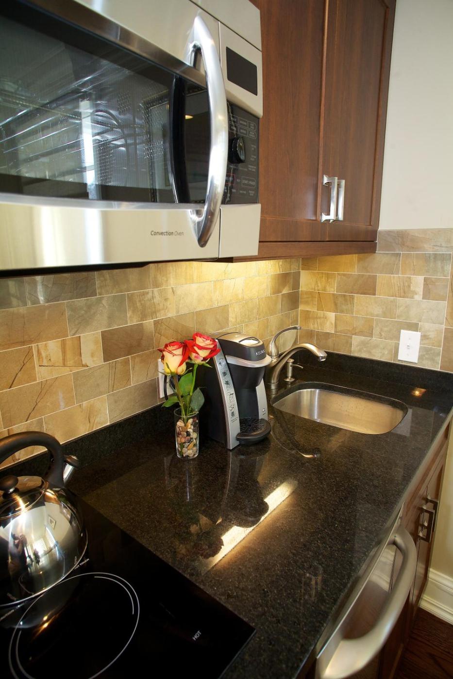 King Studio. This studio offers a queen-size bed, hardwood floors, large living room area with optional sleeper sofa, coffee tables and a fully equipped kitchen with granite countertops and stainless steel appliances. The studio also has a double-door closet, granite bath with glass-enclosed shower, and flat-screen TV. Amenities include free Wi-Fi, cable TV, cordless direct-dial telephones with voice mail, and spa bath products. ;