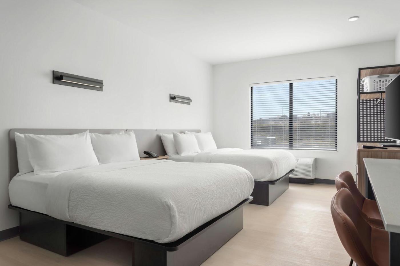 Studio with Two Queen Beds and Roll-In Shower - Mobility and Hearing Accessible. The unit has 2 beds. ;