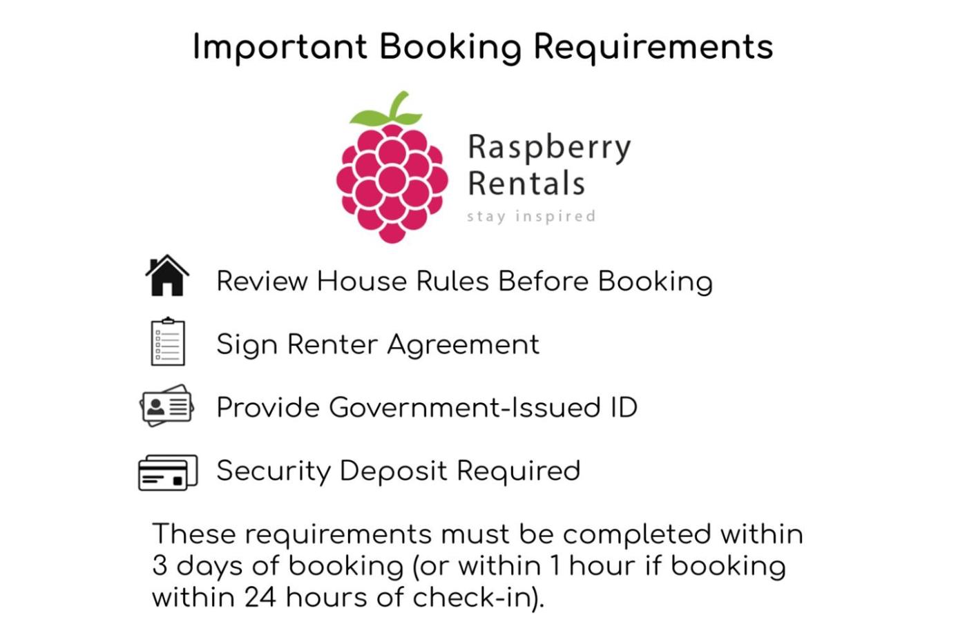 Guests are required to sign and abide by the Renter Agreement provided upon booking, as well provide us with a copy of your government-issued ID, and to place a security deposit on file with us via your credit card (shared space rentals do not require a security deposit). These are required within 3 days of making your reservation, or, if your stay is within 24 hours, within one hour of making your reservation, or your reservation will be canceled andor you will not be allowed access to the rental property. Residents of the state of Illinois are required to provide an additional security deposit andor documentation upon request, and may also be required to sign a Renter Agreement Addendum.Guests are required to show a photo identification and credit card upon check-in. Please note thatSpecial Requests are subject to availability and additional charges may apply.