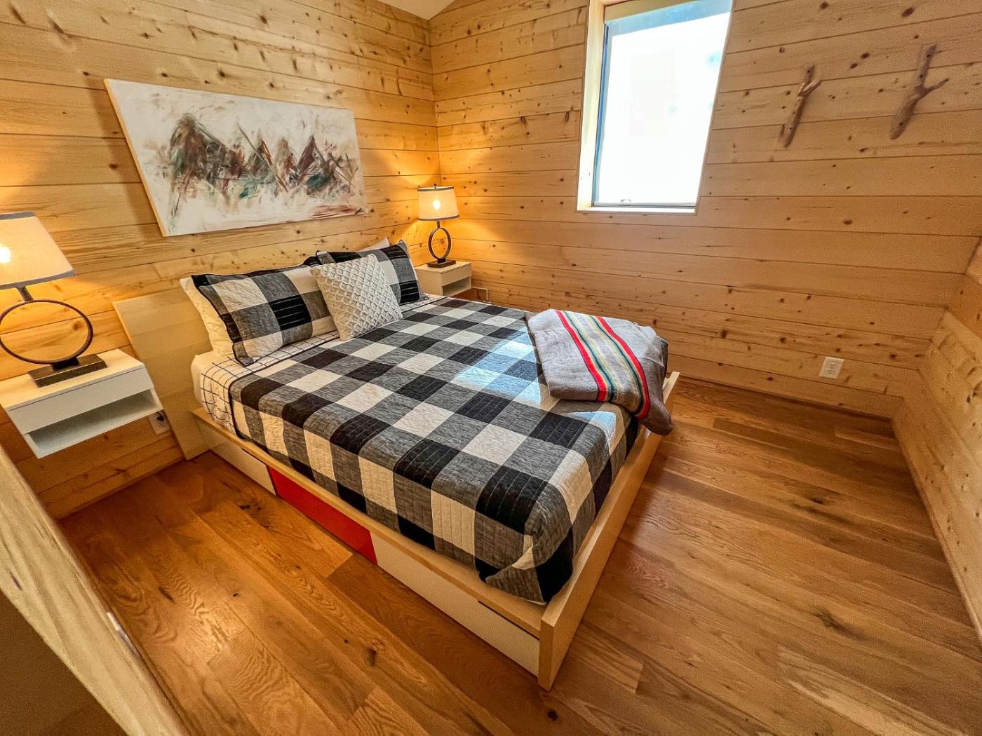 Two-Bedroom Cabin. Guests will have a special experience as the chalet offers a fireplace. Boasting a private entrance, this spacious chalet also includes 2 separate bedrooms and 2 bathrooms with a shower and a hairdryer. Guests will find a stovetop, a refrigerator, kitchenware and a microwave in the kitchen. The chalet also features a barbecue. This air-conditioned chalet consists of a dining area, a TV with cable channels a washing machine and a terrace. The unit has 5 beds.